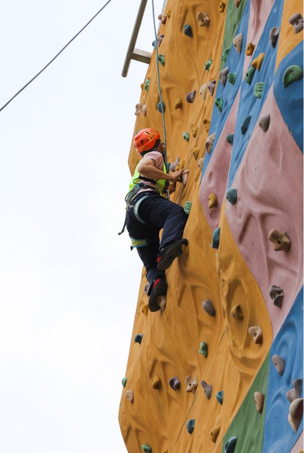 “勇攀高峰”,隊(duì)員在穿戴好裝備的前提下,按照教練的指導(dǎo),進(jìn)行攀登。此次有眾多“勇士”成功登頂,女漢子的表現(xiàn)亦是可圈可點(diǎn)。