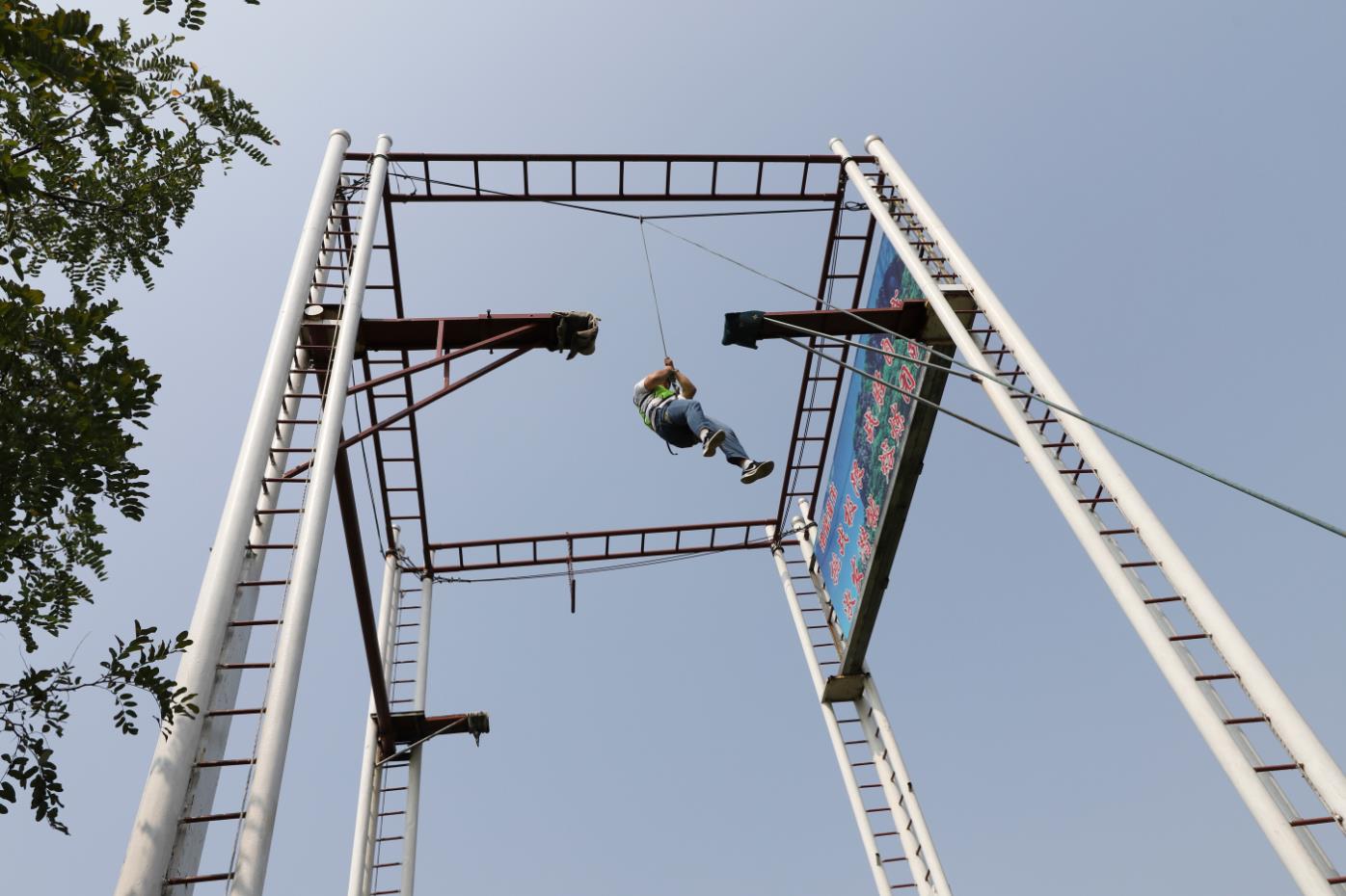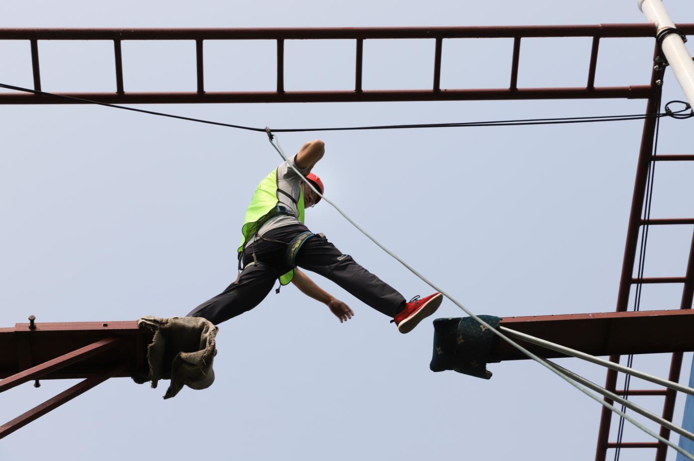 “高空斷橋”,隊(duì)員爬上距離地面 8 米的高空平臺(tái), 然后跨過(guò)一米距離的寬度,邁上固定的平臺(tái),最后原路返回,完成兩次跨越后回歸地面。