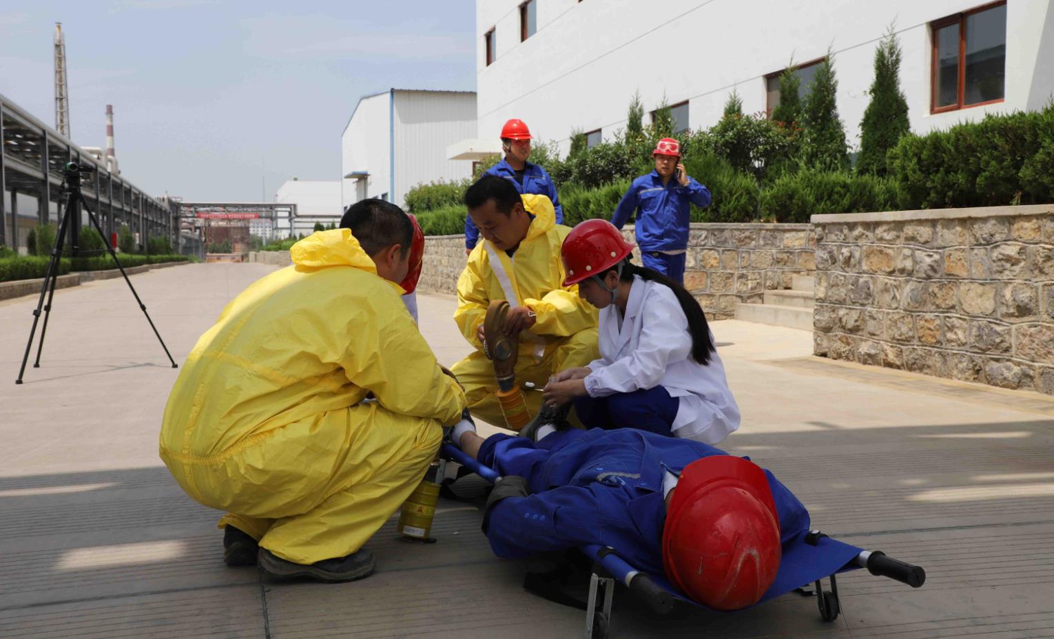 演練活動從下午1點30開始,演練內(nèi)容為模擬員工進行生產(chǎn)設備操作時氟化氫管道突發(fā)泄漏并受傷倒地呼救,車間負責人收到呼救信息后迅速了解事故概況,判斷事故級別,并立即通知相關部門啟動應急救援預案展開救援。